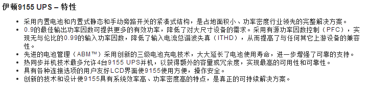 伊頓9155 UPS為公司企業(yè)、醫(yī)療機(jī)構(gòu)、銀行和工業(yè)應(yīng)用場(chǎng)合中的IT和電氣工程基礎(chǔ)設(shè)施或其它關(guān)鍵系統(tǒng)提供優(yōu)質(zhì)雙轉(zhuǎn)換后備電源和可升級(jí)的運(yùn)行時(shí)間。9155 UPS可以用很小的占地空間提供最大的電池運(yùn)行時(shí)間,是真正的全三相電源保護(hù)解決方案。